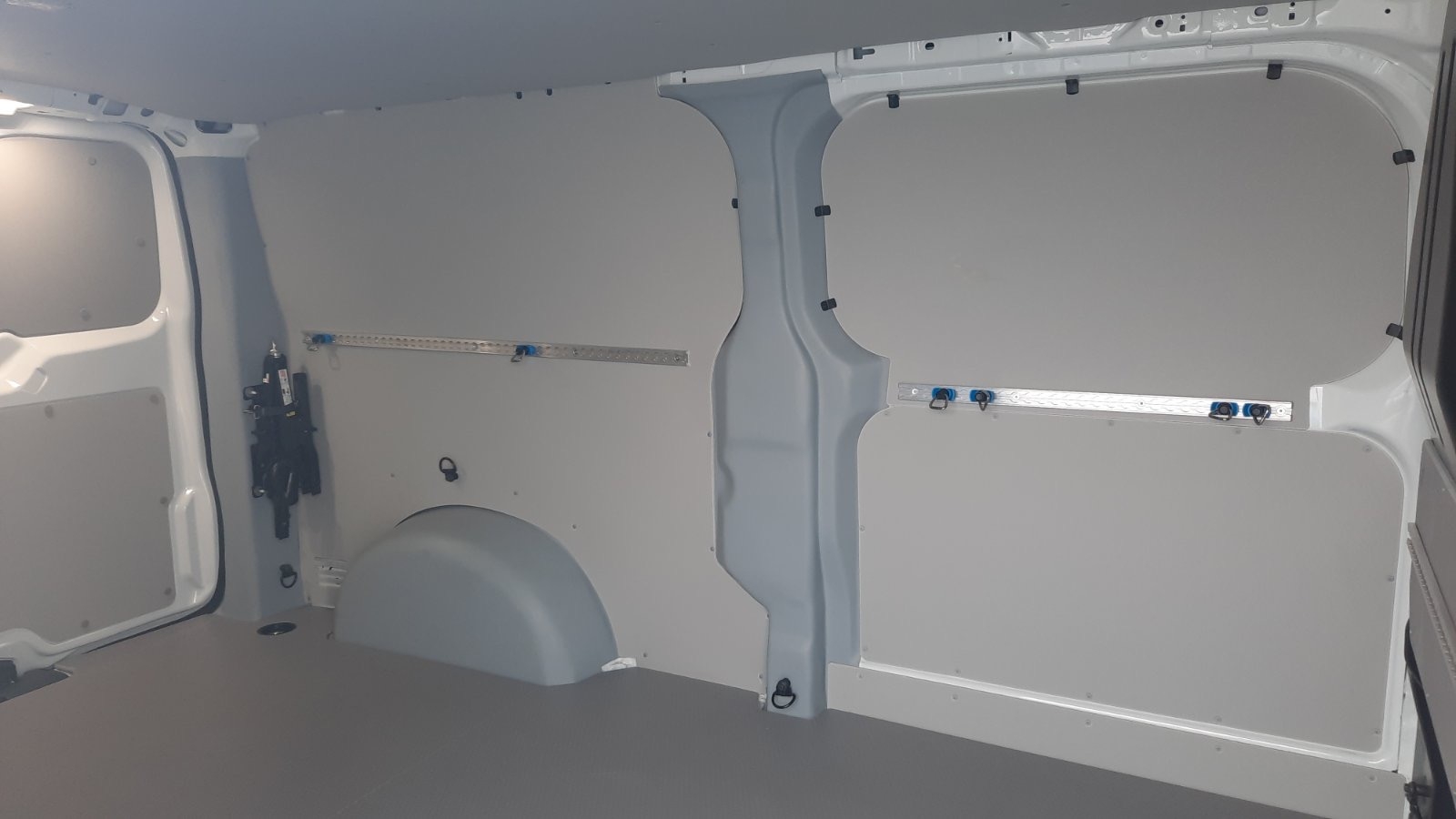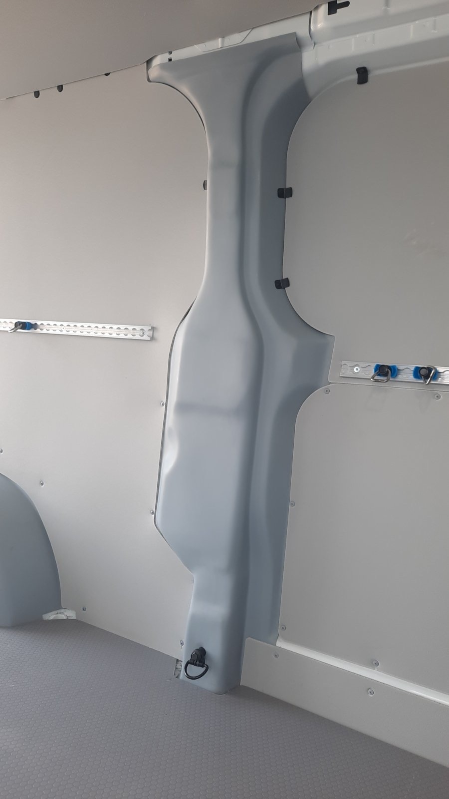Toyota Proace XL rakományrögzítő megoldással A Proace leghosszabb kivitelébe került Van-Pack PREMIUM üvegszálas burkolat, az oldalfalak így 100%-os borítást kapnak.. A padlóburkolat 10mm szürke fenolos bevonatú rétegelt lemezből készült, melybe rakományrögzítő síneket süllyesztettünk.