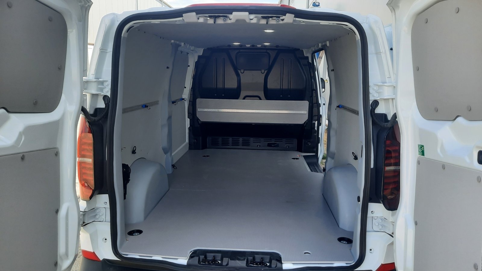 A padlóburkolat 10mm HEXA mintázatú műanyag bevonatú rétegelt lemezből készült, oldalburkolat a legújabb cartonplast műanyagból világosszürke színbe, Van-Pack saját fejlesztésű kerékdobvédővel, oldalfalra egyedi rakományrögzítő sín és fül. A tolóajtóval szembe moduláris csavarmentes polc került a szerszámok tárolására.