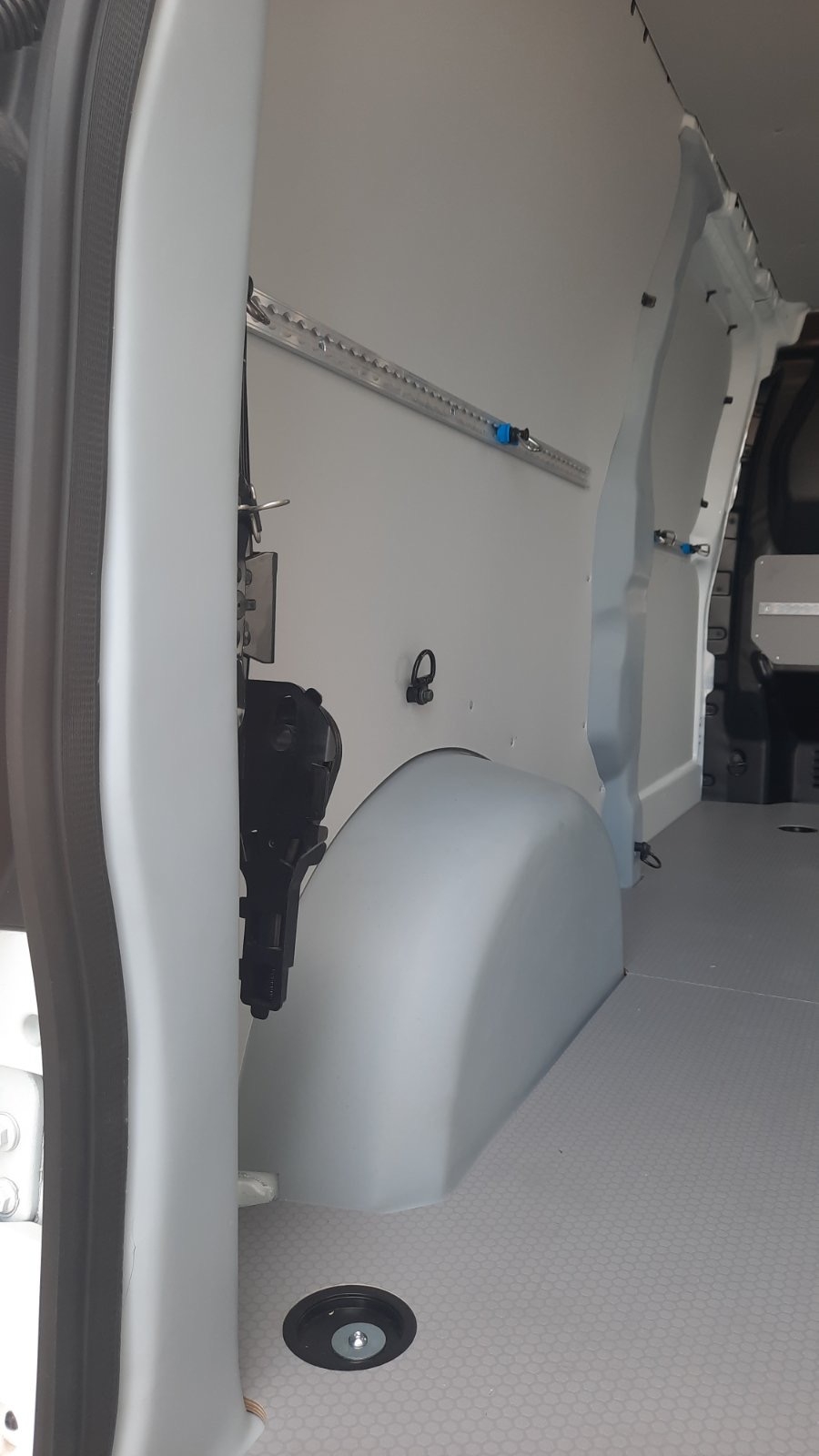 Volkswagen Crafter Teljes műanyag burkolat és rakományrögzítés Padlóburkolat 9mm csúszásmentes lemezből, süllyesztett rögzítéssel. Oldalburkolat 4,5 mm vastag sejtszerkezetes műanyag lemezből készült méretpontos elemekkel, mely alá 5cm szigetelés került. A kerékdob védelmét üvegszálas formatarvezett kerékdob védő látja el. A burkolaton a C oszlopig rögzítő sín fut végig.