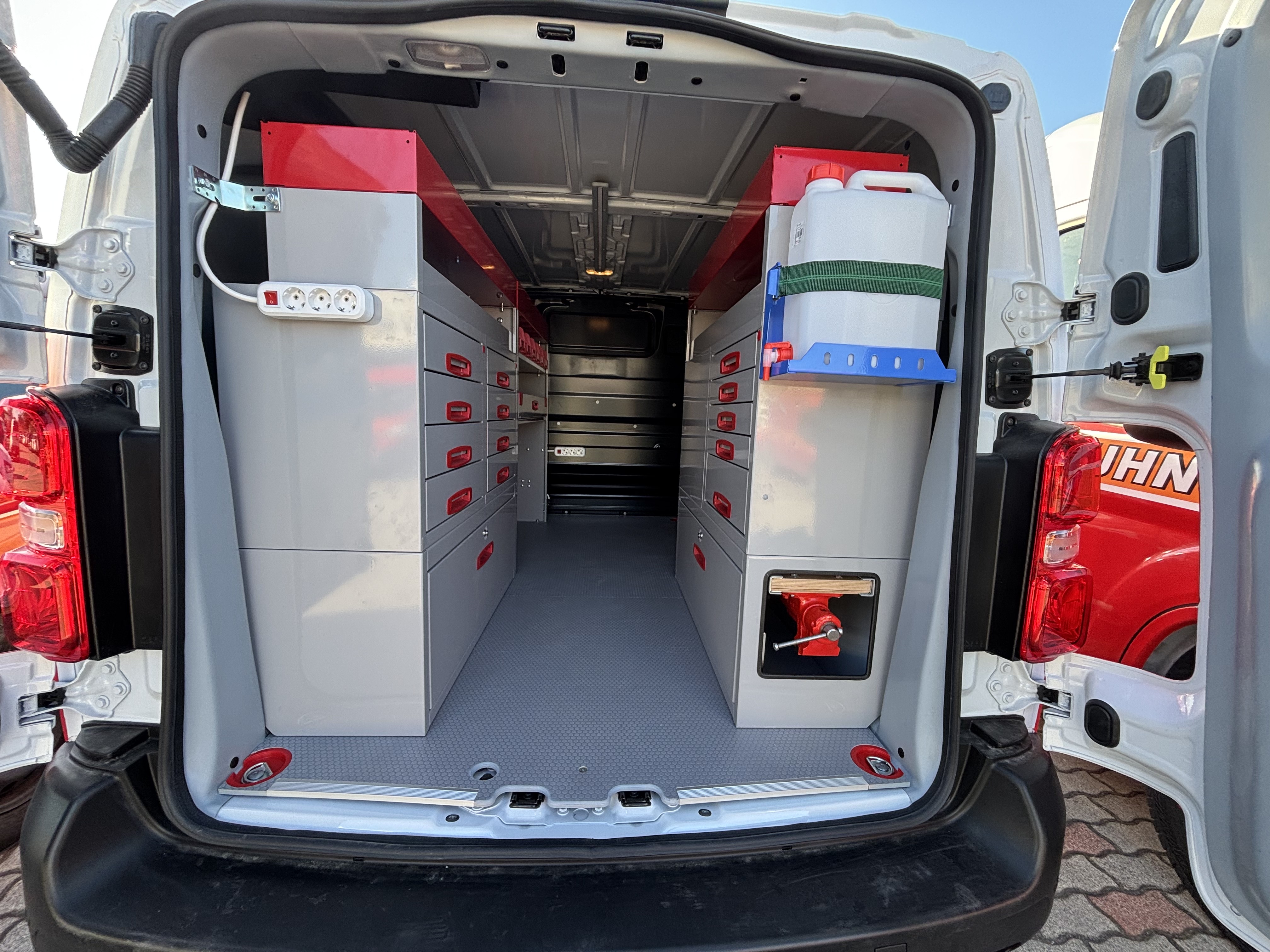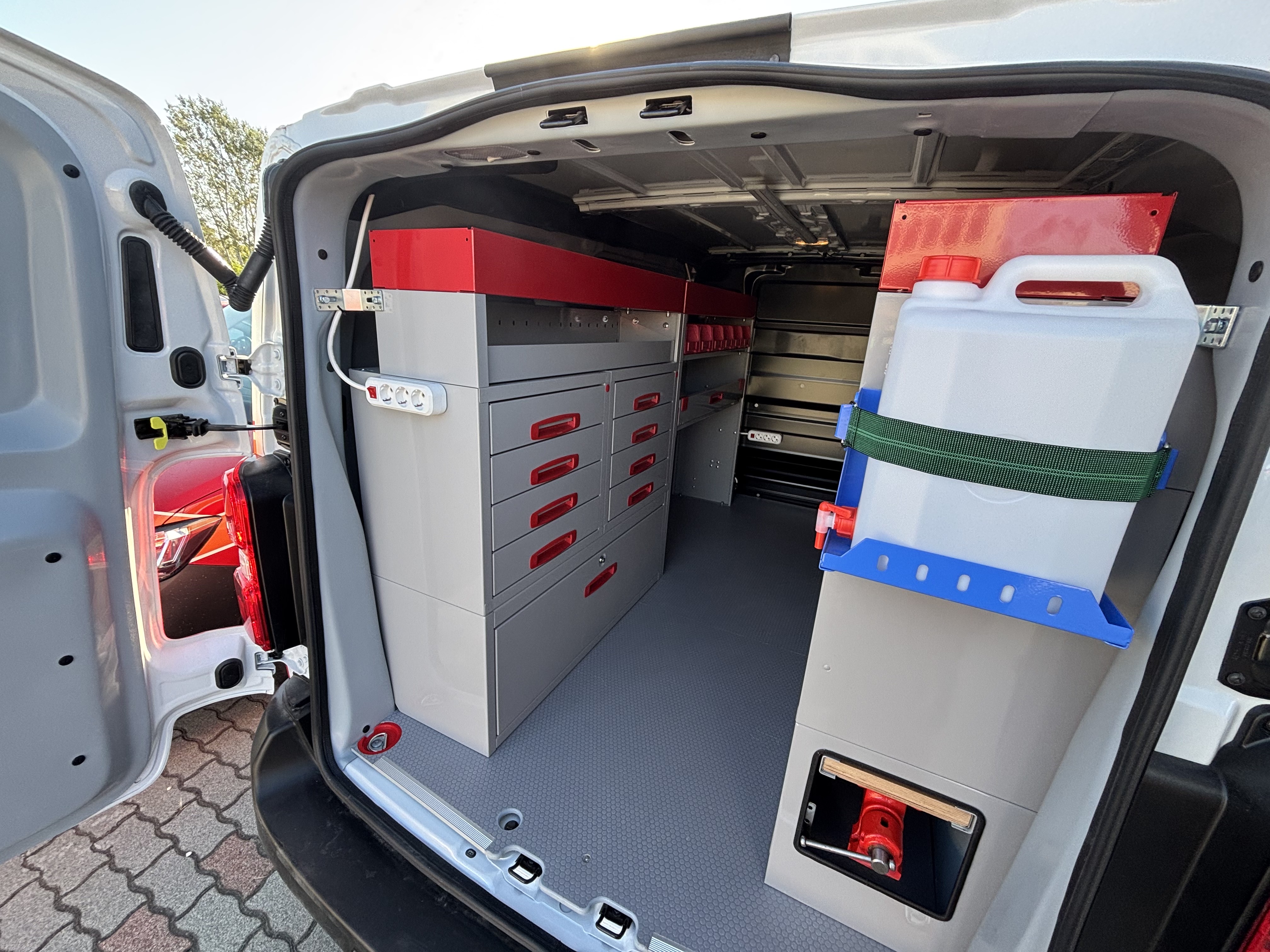 Padlóburkolat 10mm HEXA mintázatú műanyag bevonatú rétegeltlemezből, teljes oldalfal burkolás 5mm sejtszerkezetes könnyített cartonplast lemezből, mely hőszigetelés szempontjából is tökéletes választás. A szerszámok és aprócikkek tárolására leborulásvédelemmel ellátott moduláris polcrendszert építettünk az autóba.