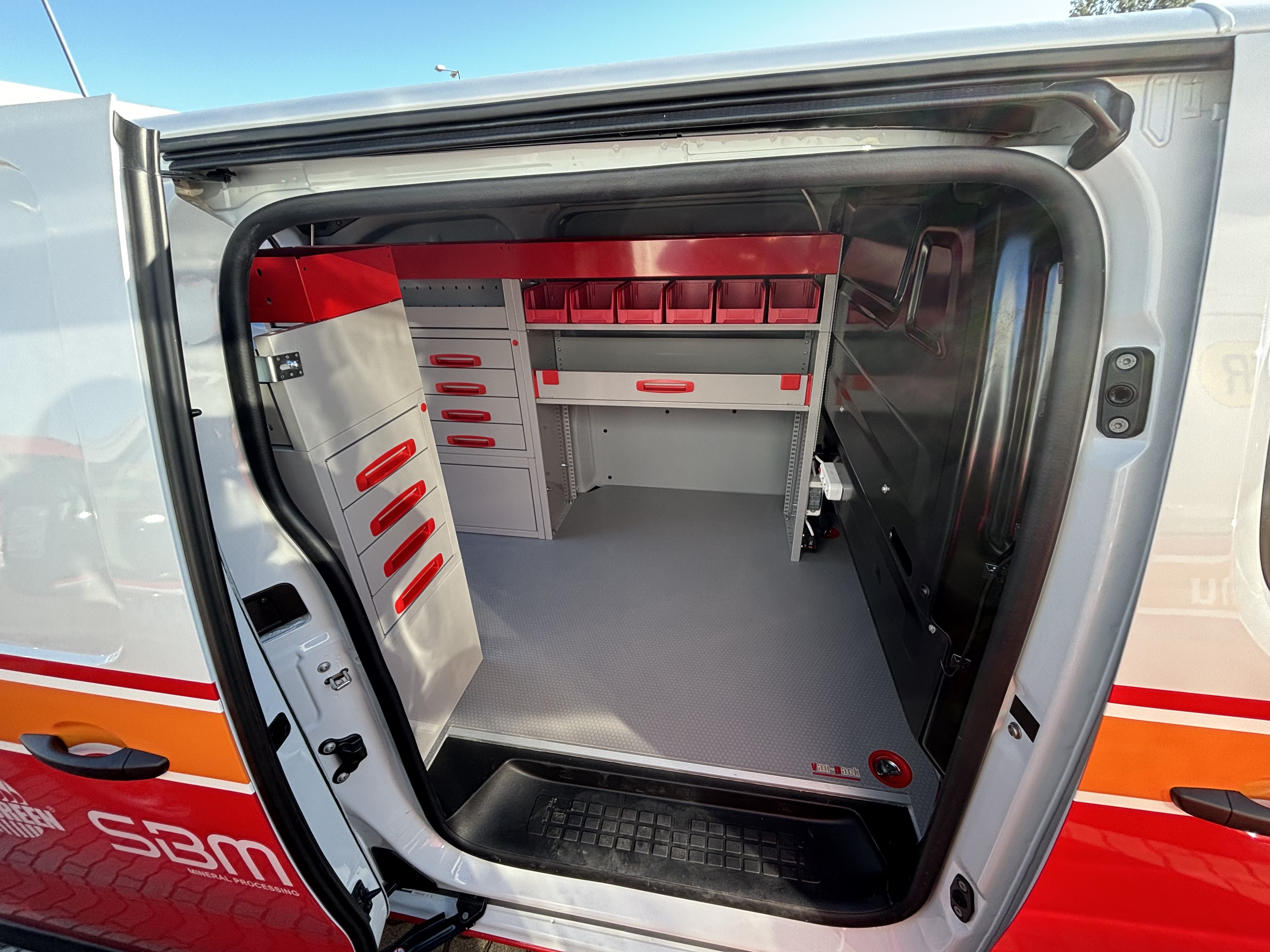 A padlóburkolat 9mm vastagságú mart felületű fenolos bevonatos rétegelt lemezből, míg az oldafalakat PREMIUM műanyag cartonplast lemezzel védtük. Kerékdobvédő VAN-PACk saját fejlesztésű üvegszálas védőburkolata. A homlokfalon (fülke fala) egyedileg tervezett polcrendszer segíti a szerszámok elhelyezését. Az autó oldalára és a fülke falára airlines rakományrögzítő sín került, állítható rögzítő fülekkel. Egyedi extraként a polcrendszerre is került rögzítő sín.