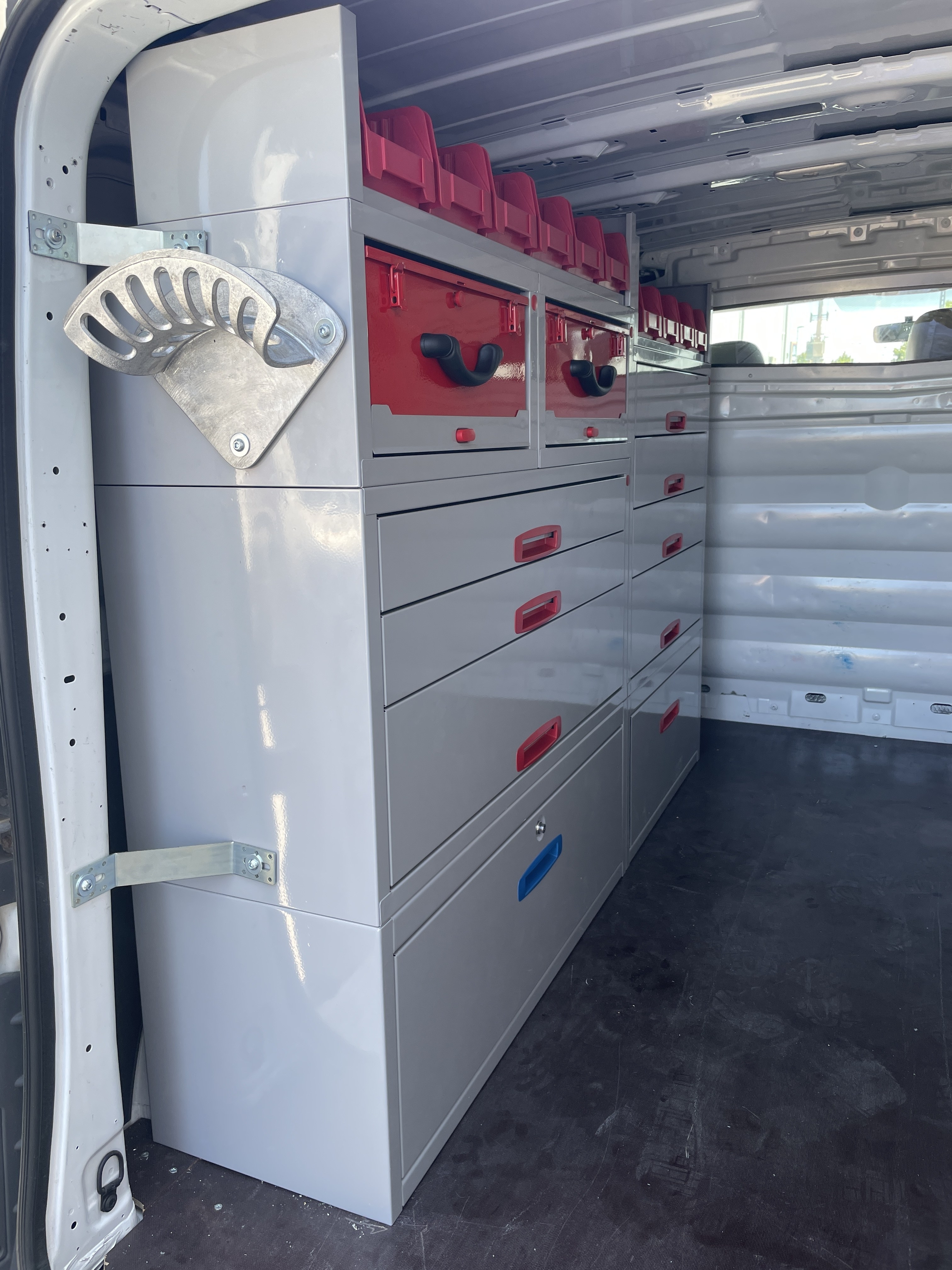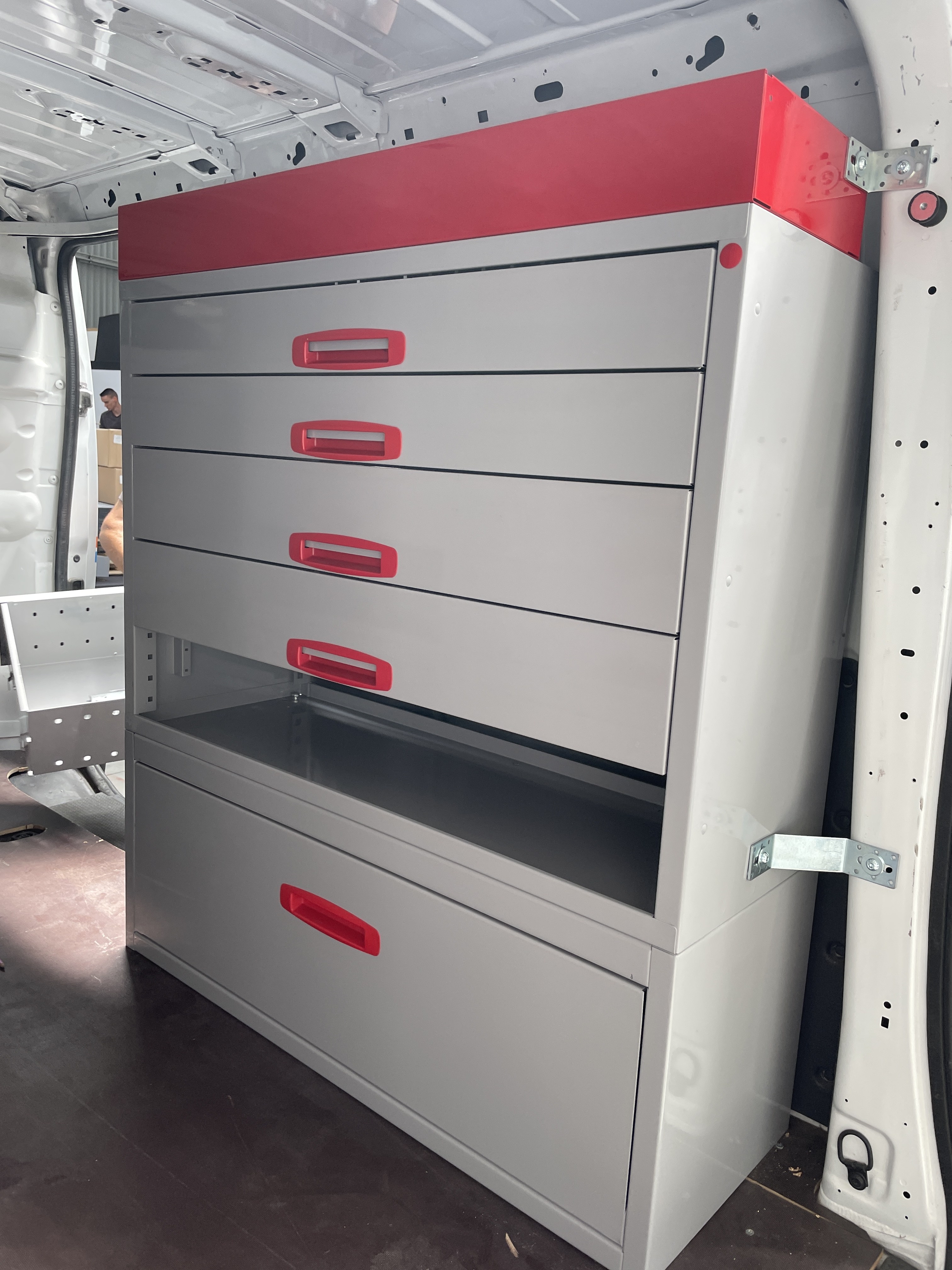 Villanyszerelő ügyfelünk egy régebbi évjáratú Renault Trafic kishaszongépjárművet vásárolt, amibe igényeinek megfelelően terveztünk belső berendezést. A cél az volt, hogy a számtalan aprócikk egy zárható szekrénybe kerüljön, illetve bizonyos fiókok mobilak lehessenek, azaz kivehető kofferként funkcionáljanak. Fontos volt, hogy a szekrény felső részén a szálanyagok tárolását is megoldjuk. Az autóba épített két mennyezetig érő szekrény beszerelését 5 óra alatt elvégeztük, amit meg is tudott várni nálunk.