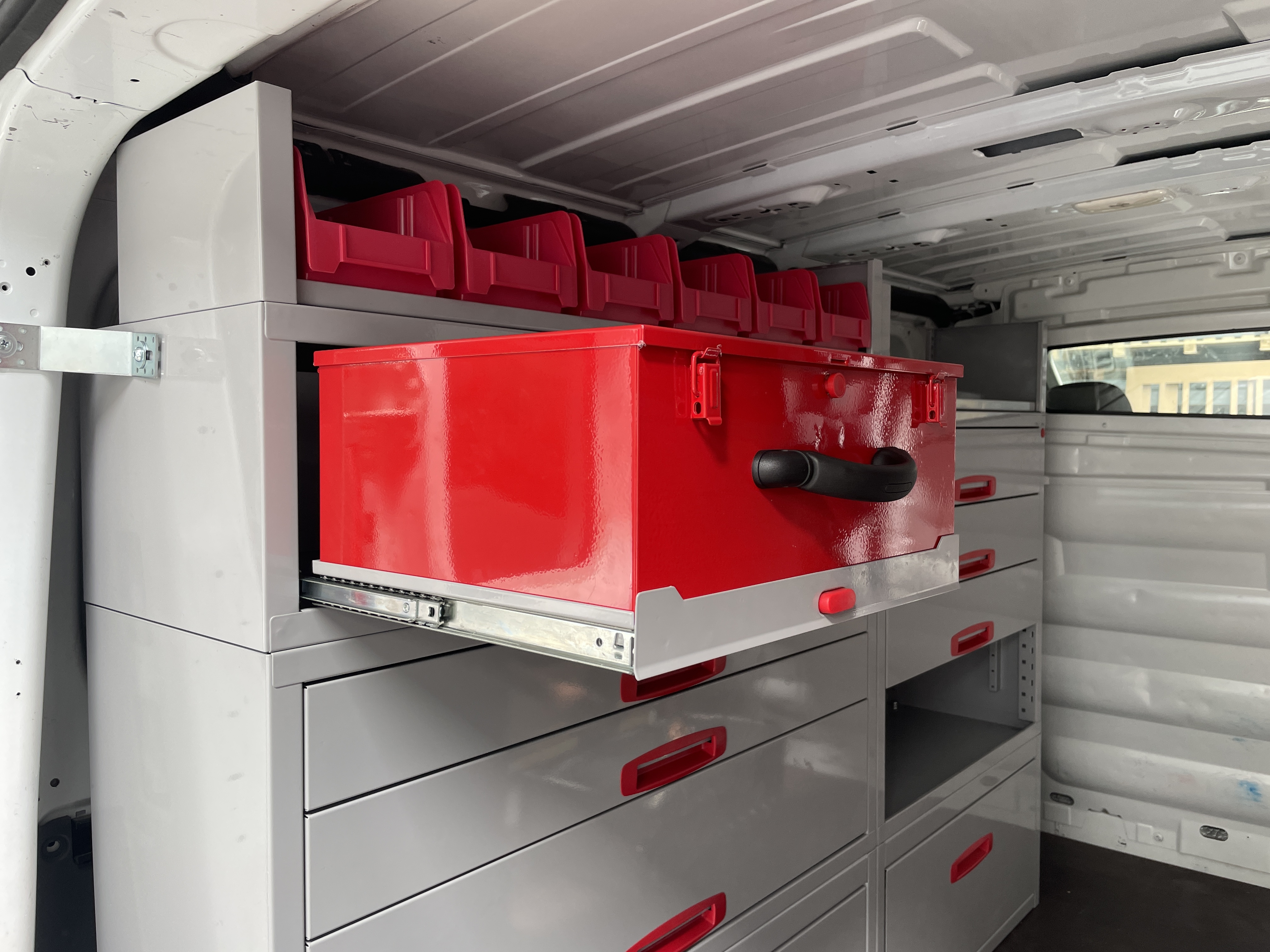 A padlóburkolat Prémium minőségű 10mm HEXA mintázatú műanyag bevonatú rétegelt lemezből készült, oldalburkolat a legújabb, a gyári VW ajtóbetétekkel azonos cartonplast műanyagból világosszürke színbe, Van-Pack saját fejlesztésű kerékdobvédővel, melyre egyedi tárolót építettünk. oldalfalra egyedi rakományrögzítő sín és fül, valamint egy létratartó is került.. A hátfalra moduláris csavarmentes polc került a szerszámok tárolására, és három egyedi tároló láda.